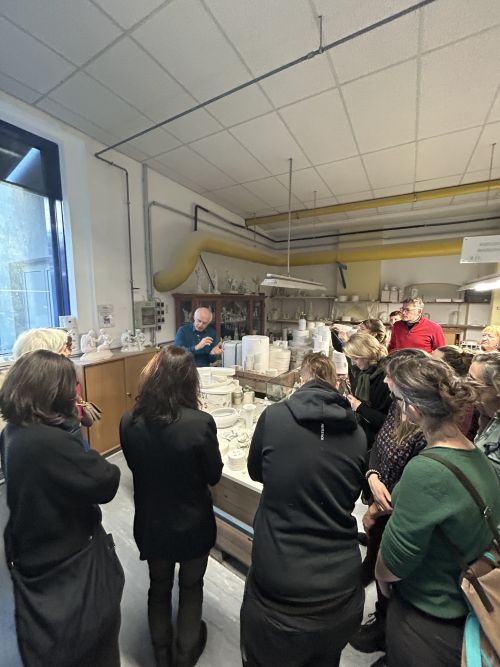 Zum Ersten ÖRV Jour Fixe des Jahres hatten unsere Mitglieder die Freude an einer Führung in den Werkstätten und dem Museum der Porzellanmanufaktur Augarten teilzunehmen. Der langjährige Porzellanmaler Isidor Stern bot spannende Einblicke in die Herstellungstechniken und die Geschichte der Manufaktur. Während des Rundgangs konnten die Mitglieder den Arbeiter:innen über die Schulter schauen. Vom Herstellen des Prototypen und der Mutterform, über das Glasieren und bemalen von Porzellangefäßen und -figurinen konnten alle Arbeitsschritte nachvollzogen und reichlich Fragen gestellt werden. Im Anschluss erfolgte eine Führung durch das Museum.